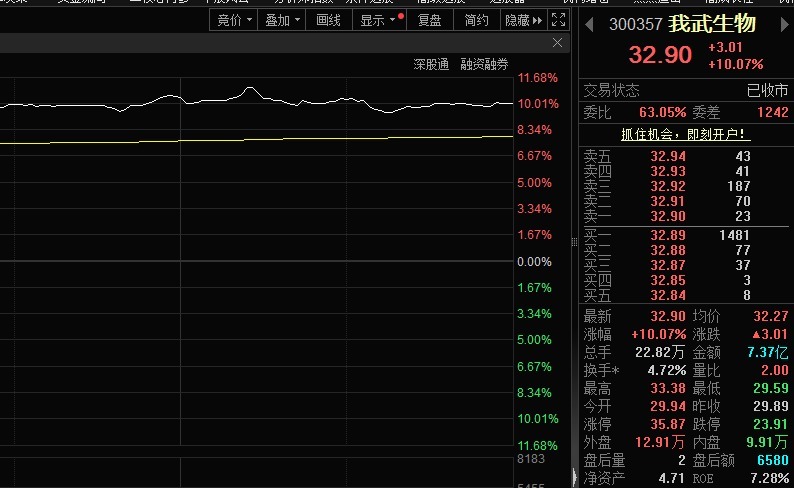 10月20日,创新药概念股集体大涨,其中我武生物(300357)股价股价涨幅达10.07%,成交额达7.37亿元。